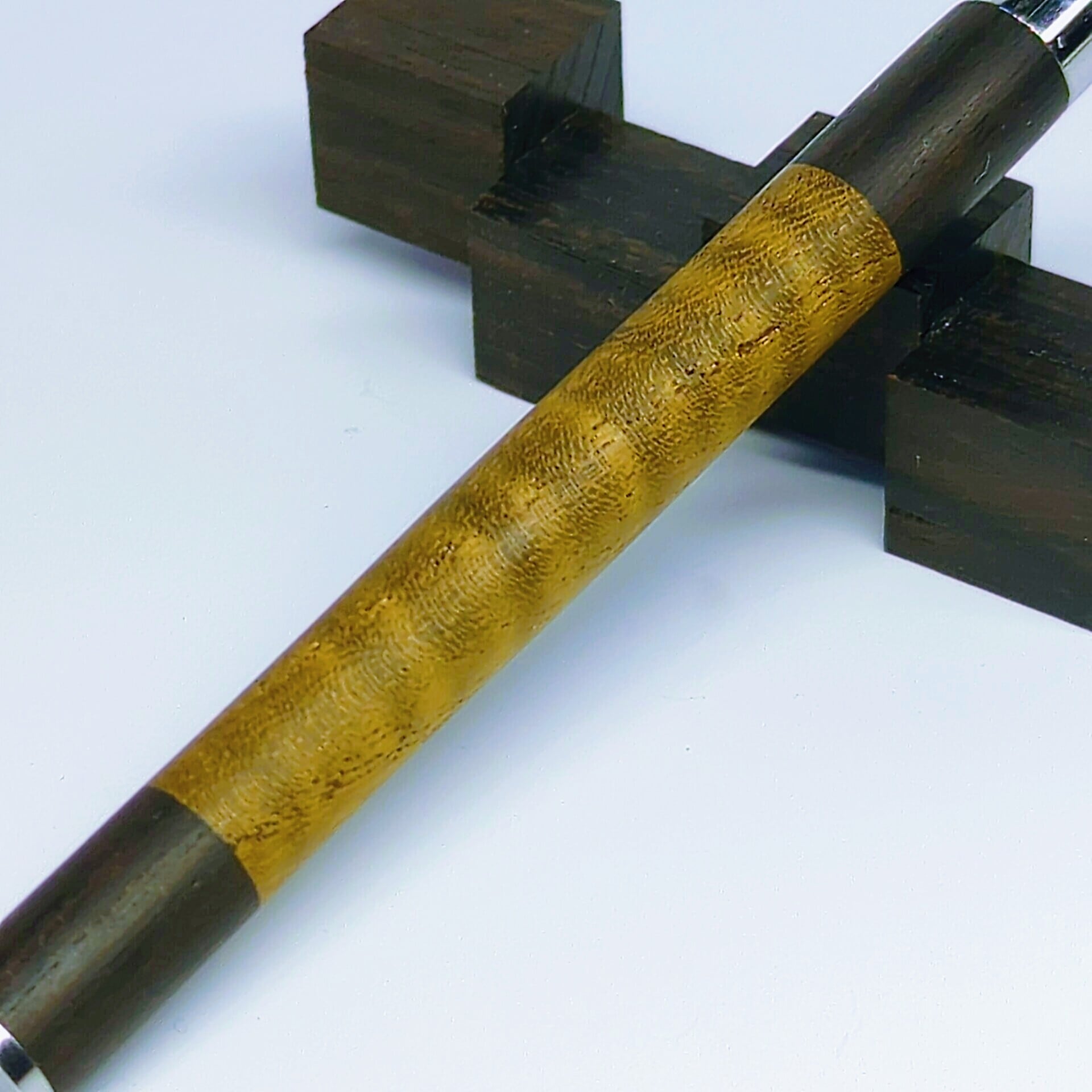 今回の入手した材は緑色を帯びた黄褐色で光沢があり、全面に縮杢が感じられる優良品で、自然の美しさに感謝しながら丁寧に製作しています。