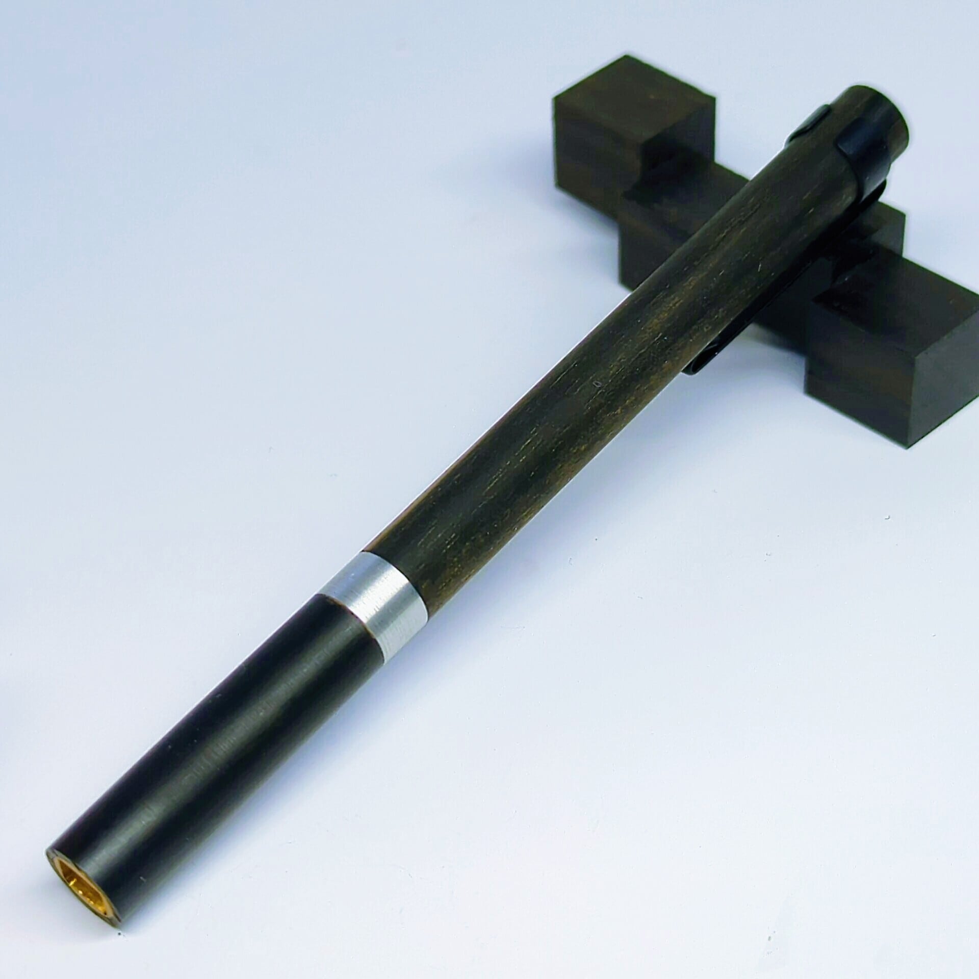 本作では、そんな黒柿の中でも力強い濃淡を持つ部位を上軸に使用し、下軸には静謐な本黒檀を組み合わせました。