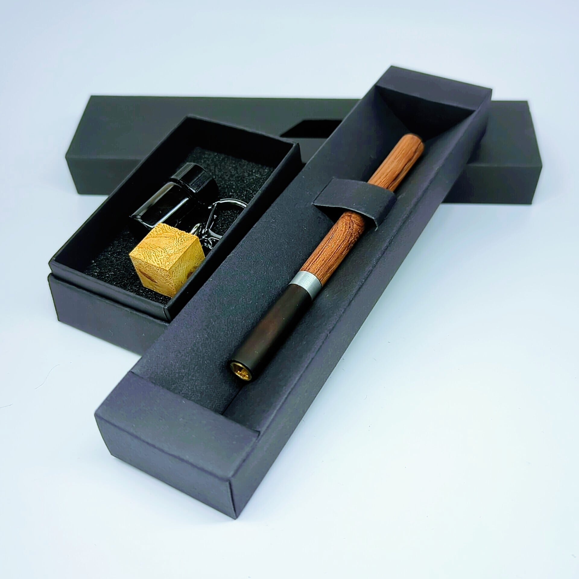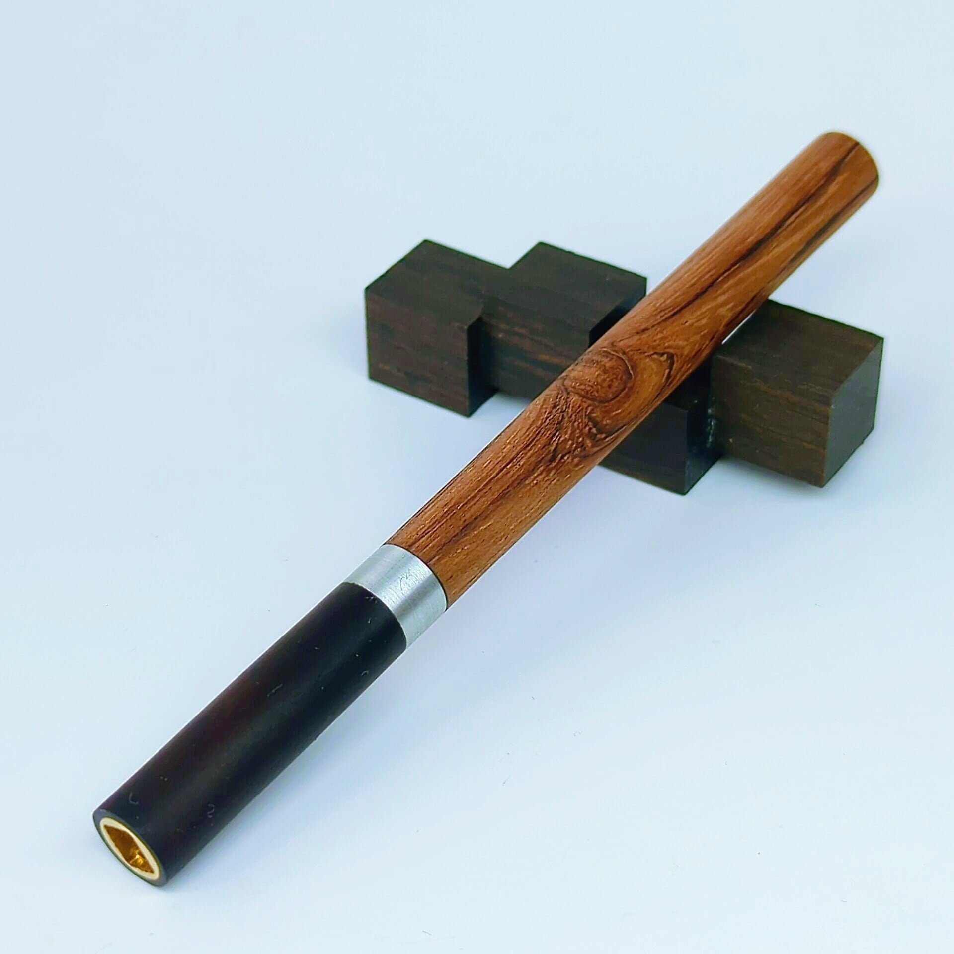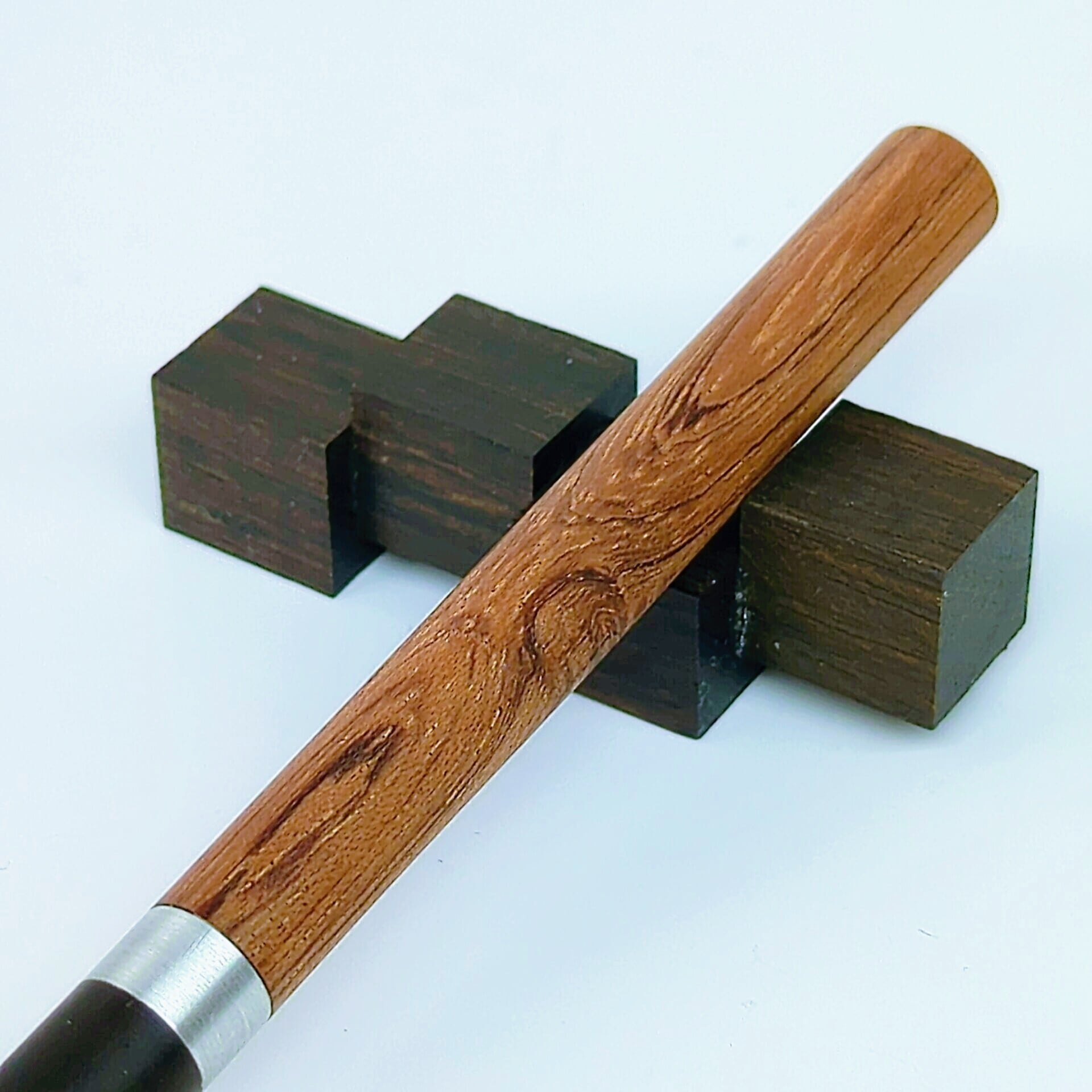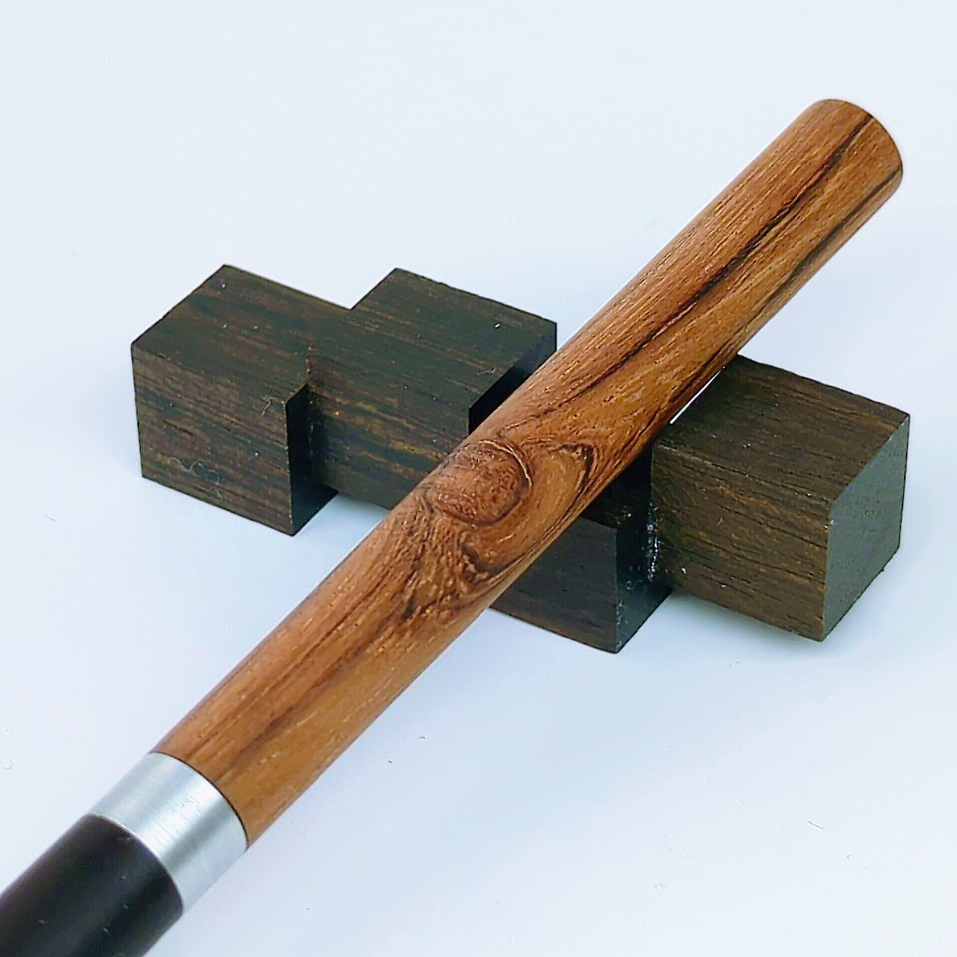 本品では、上部にブビンガを、下部には漆黒の本黒檀をあしらい、天然素材の美と重厚感を融合させています。