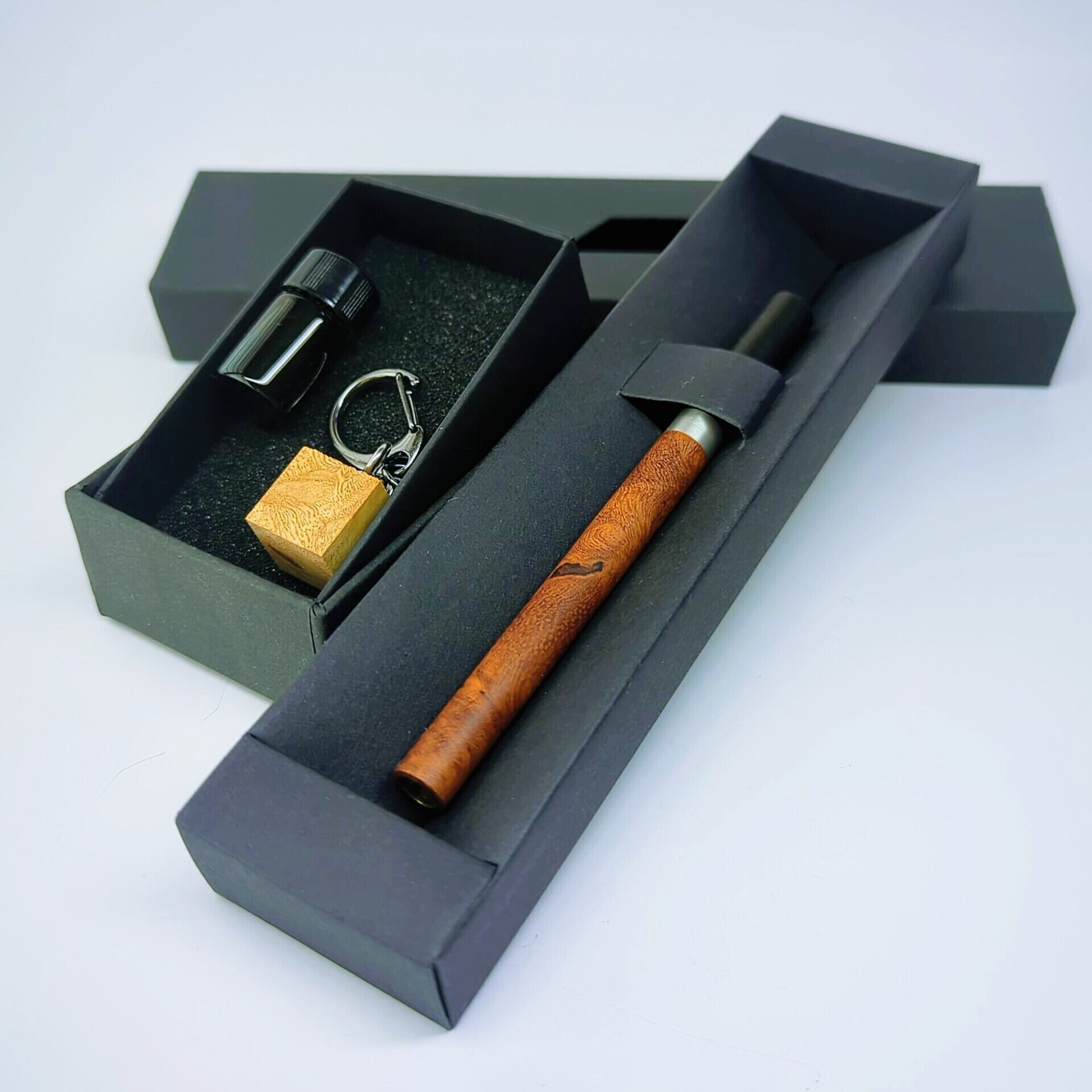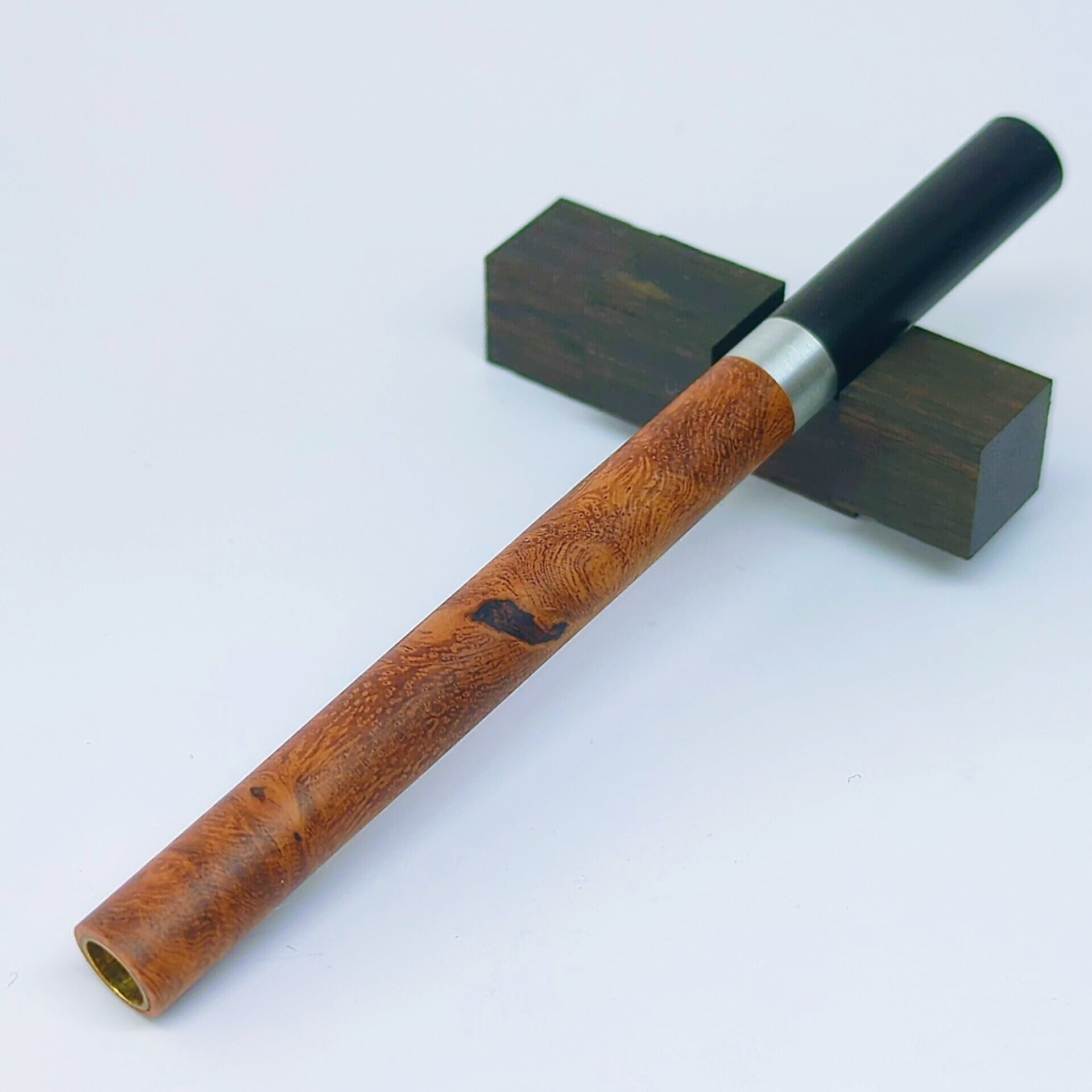 本品では、上部に「花梨瘤」を、下部には漆黒の「本黒檀」をあしらい、天然素材の美と重厚感を融合させています。