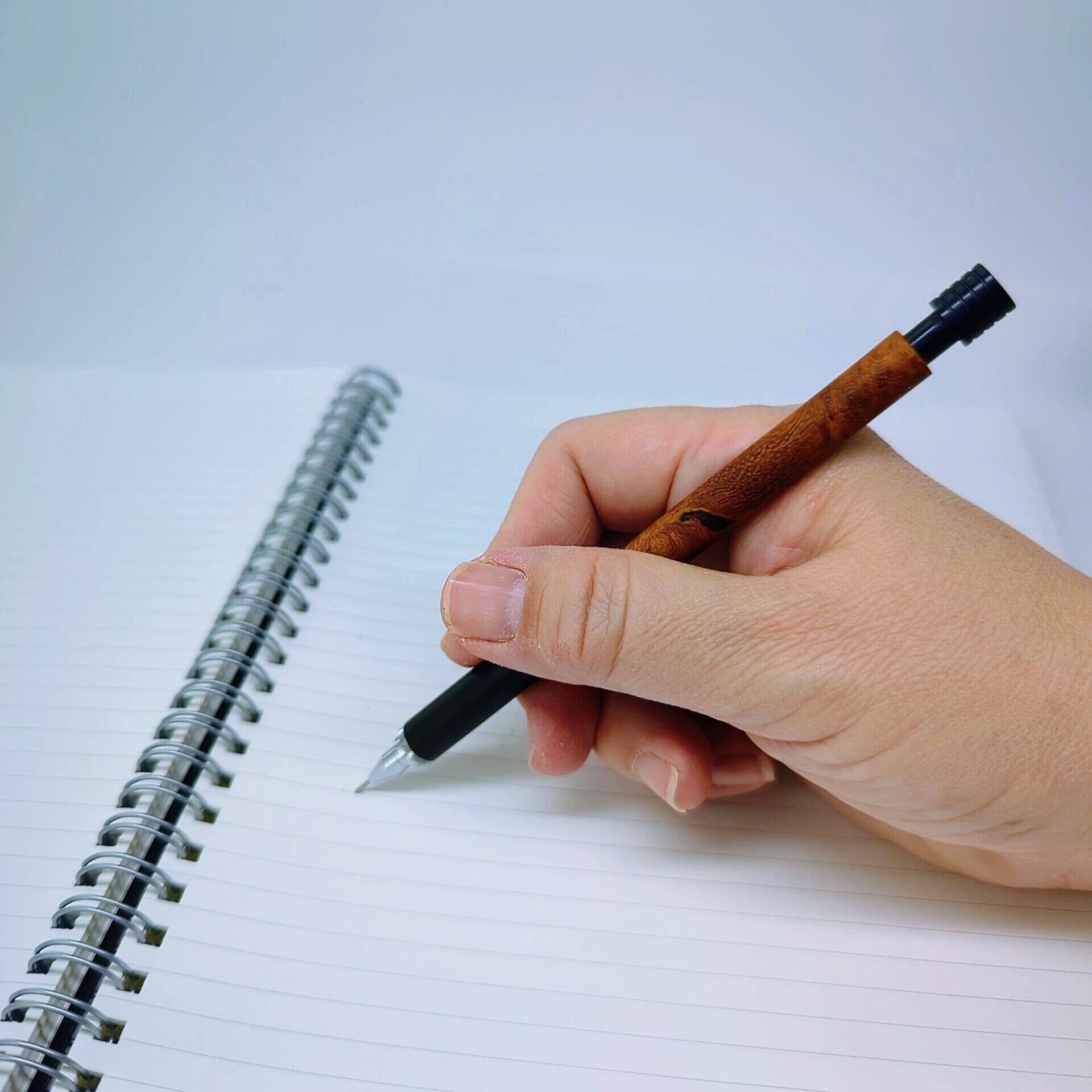 木材特有のなめらかな質感を活かし、強く握り込むのではなく、軽く持って書くことを想定した設計です。