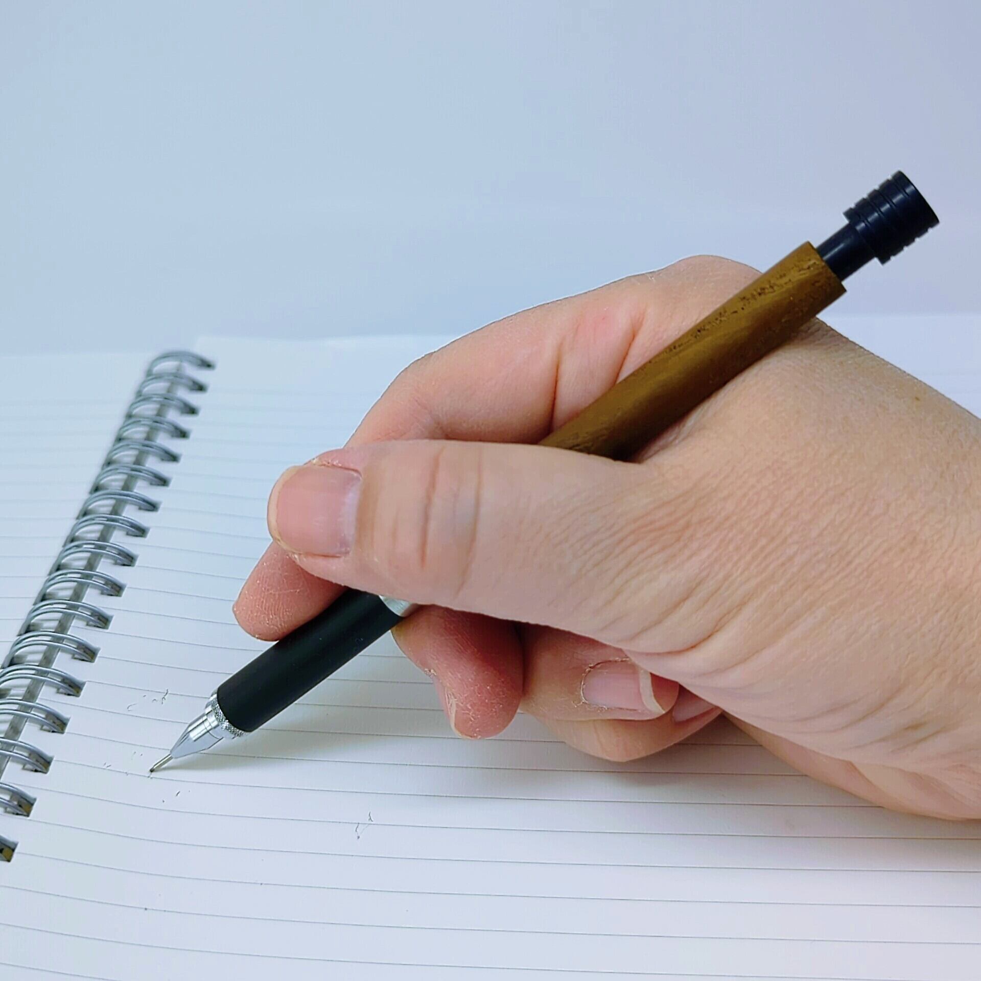 木材特有のなめらかな質感を活かし、強く握り込むのではなく、軽く持って書くことを想定した設計です。