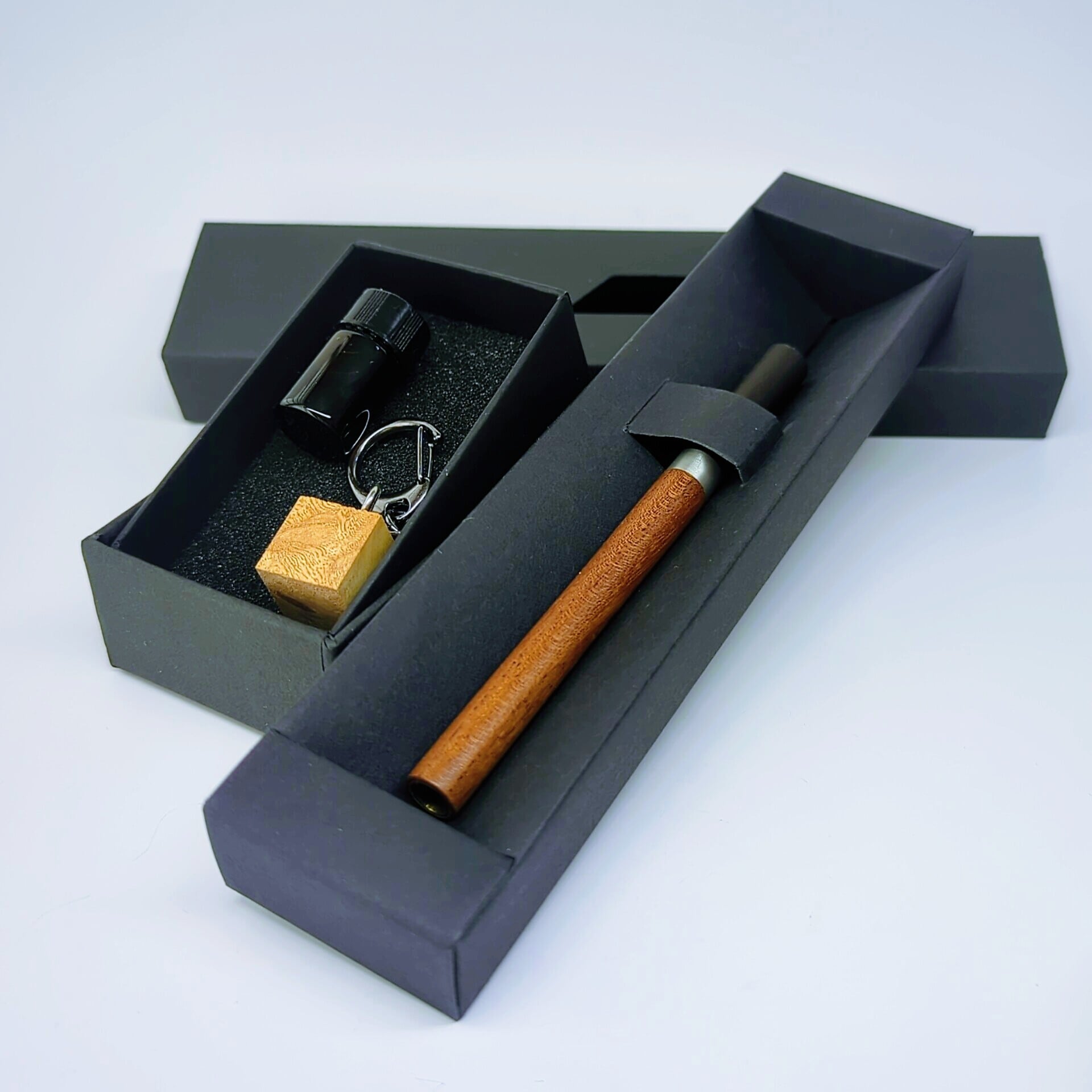 本品では、上部に「ケヤキ」を、下部には漆黒の「本黒檀」をあしらい、天然素材の美と重厚感を融合させています。