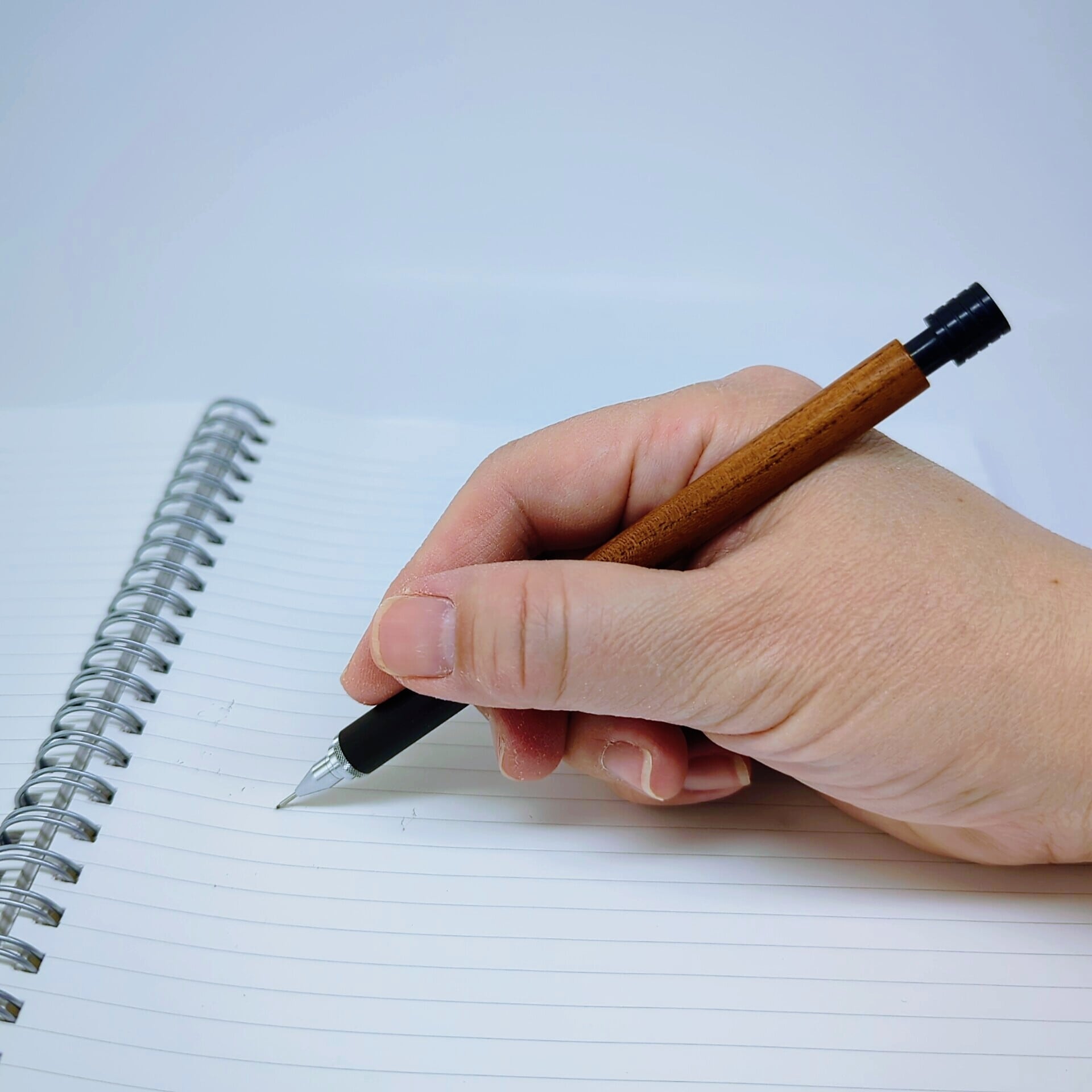 木材特有のなめらかな質感を活かし、強く握り込むのではなく、軽く持って書くことを想定した設計です。