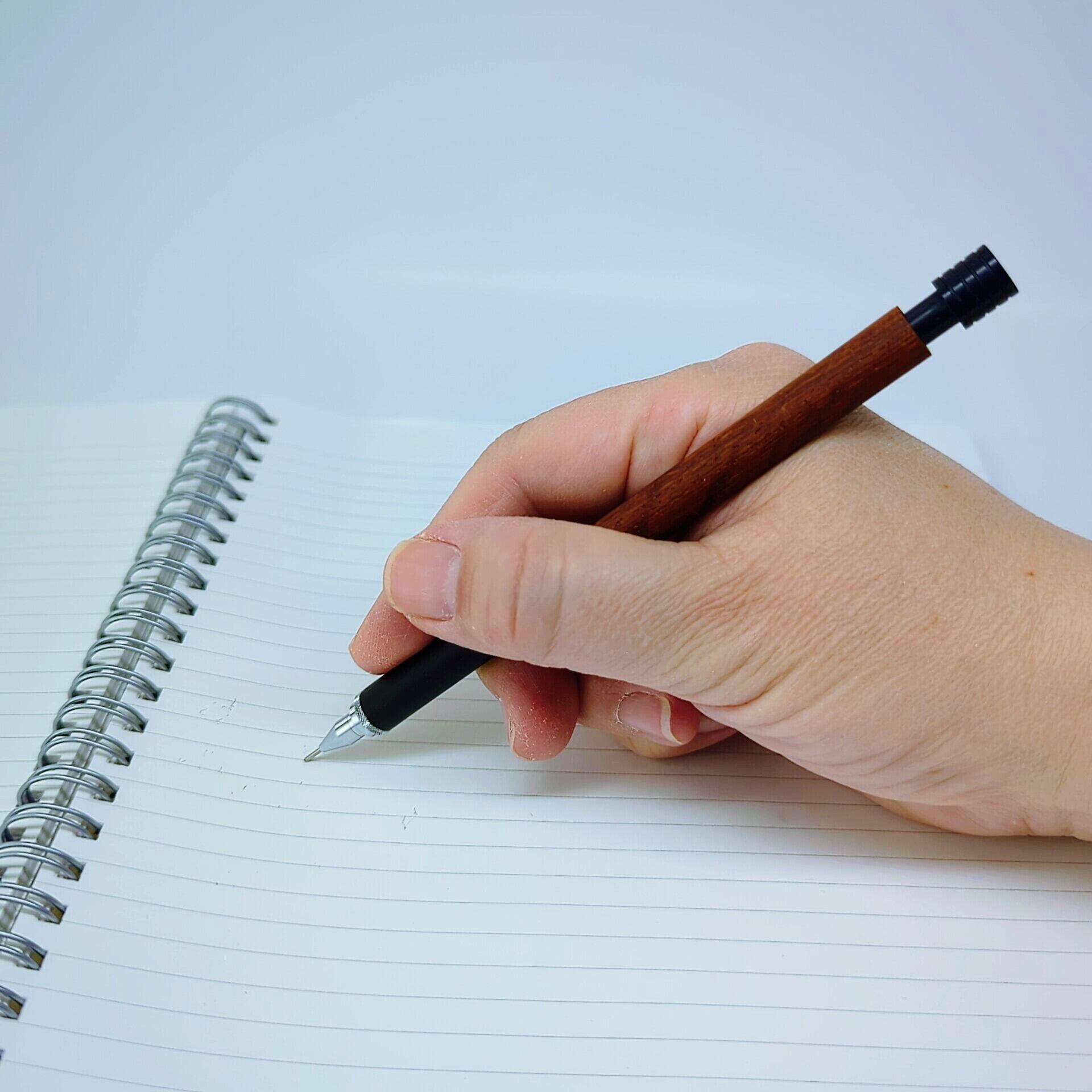 木材特有のなめらかな質感を活かし、強く握り込むのではなく、軽く持って書くことを想定した設計です。